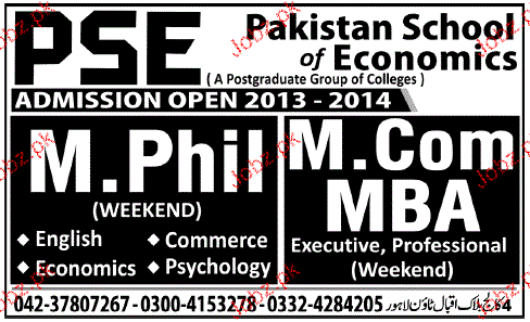 Admission in Mphill, M.com and MBA in Pakistan School Economics in Lahore Read newspaper ad for exact details.