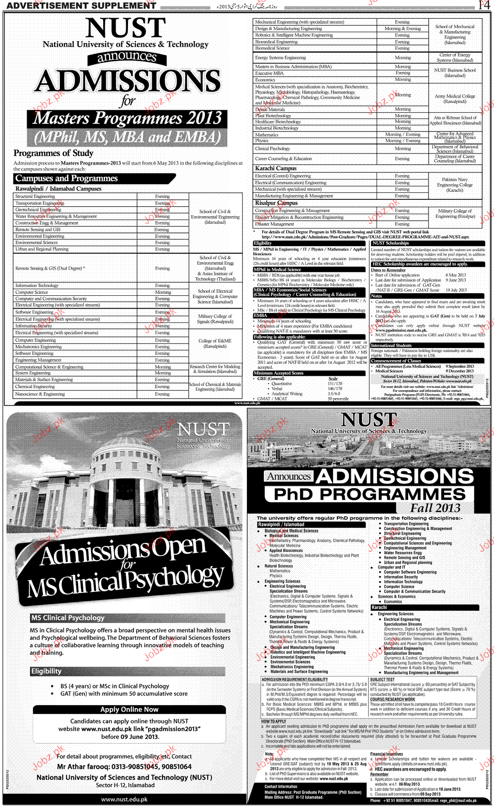 Admission in Mphill, MS, MBA and EMBA in Nationional University of Science and Technology in Islamabad Read newspaper ad for exact details.