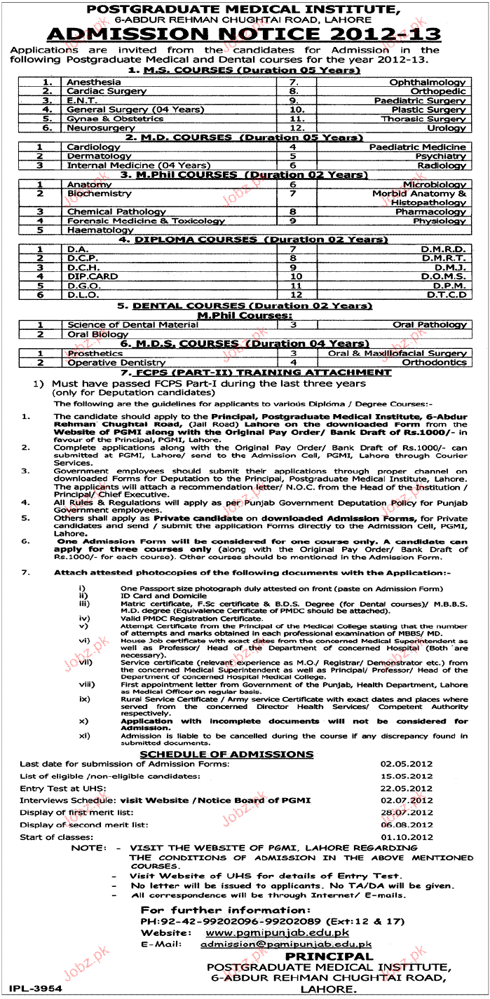 Admission in MS Courses, MPhill, Diploma and Dental Course in Postgraduate Medical Institute in Lahore Read newspaper ad for exact details.