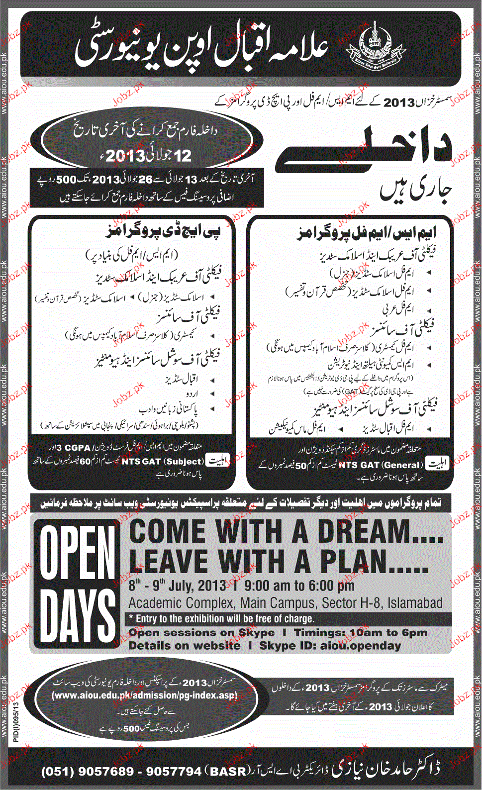 Admission in MS / Mphill and Phd in Allama Iqbal Open University in Islamabad Read newspaper ad for exact details.