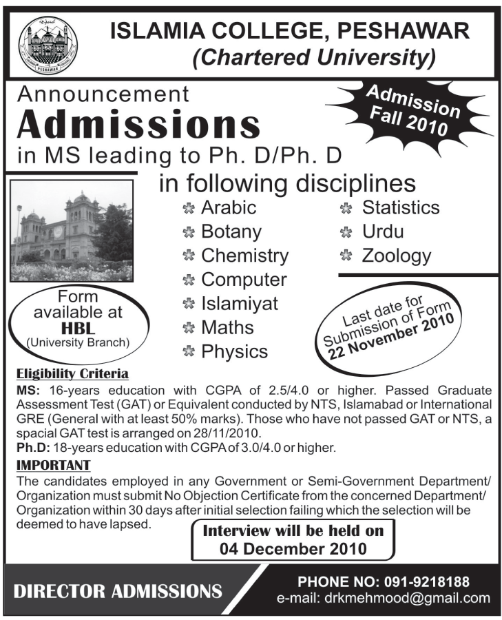 Admission in MS.& Ph.D in Islamia College Peshawar Read newspaper ad for exact details.