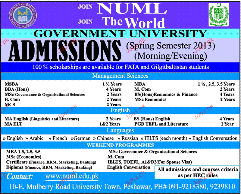 Admission in MSBA, MA, M.COM, BS, MSc and MBA in National University of Modern Languages in Peshawar Read newspaper ad for exact details.