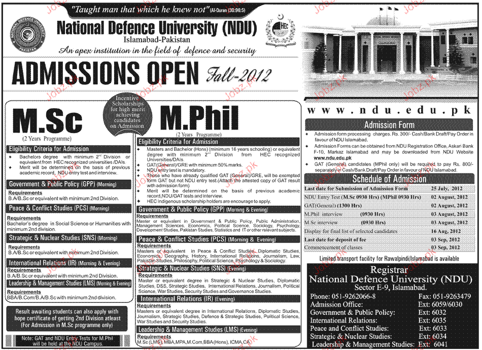 Admission in MSc and Mphill in National Defence University in Islamabad Read newspaper ad for exact details.