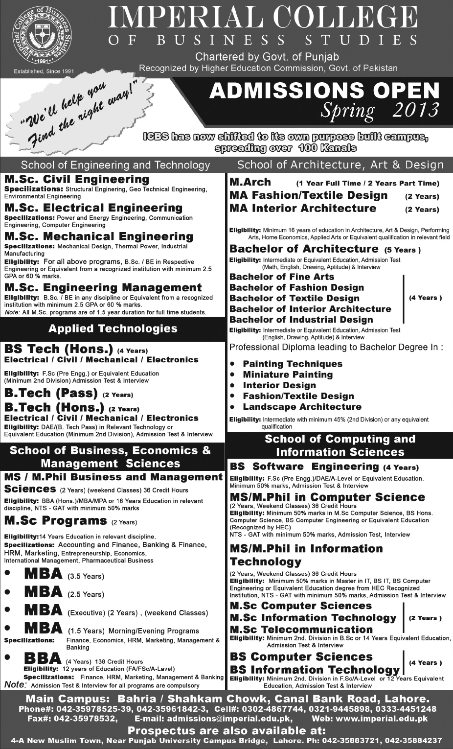 Admission in MSc, BS, MS, B-Tech, Mphill, Phd, MA and MBA in Imperial College of Business Studies in Lahore Read newspaper ad for exact details.