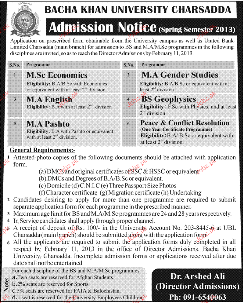 Admission in M.Sc Ecoomics, MA Gender Studies, MA English, MA Pashto in Bacha Khan University Charsadd in Charsadda Read newspaper ad for exact details.