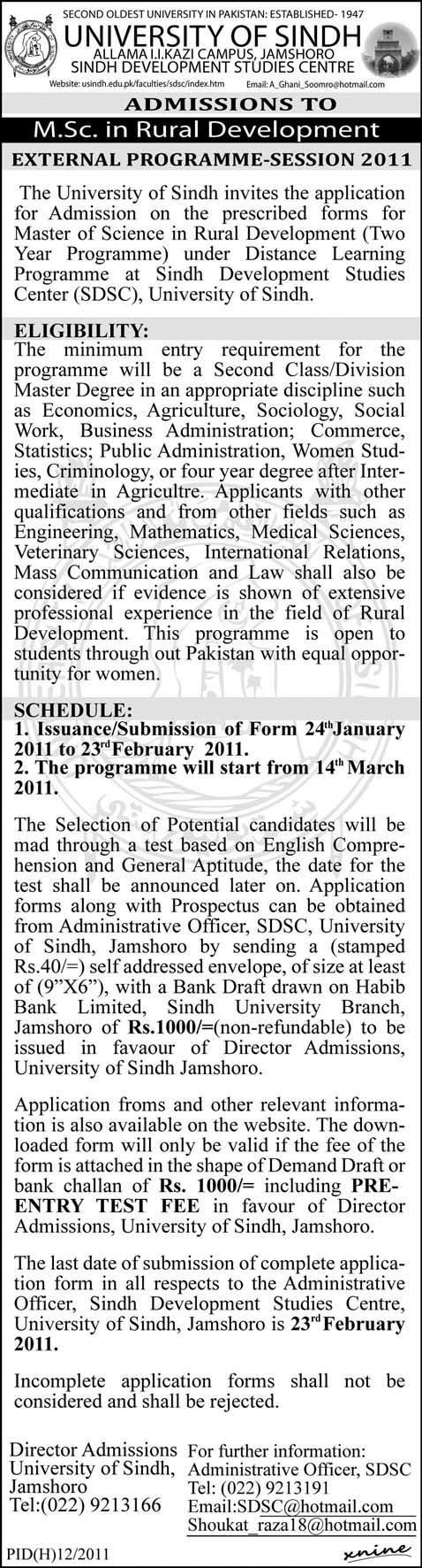 Admission in M.Sc in Rural Development in University of Sindh Jamshoro Read newspaper ad for exact details.