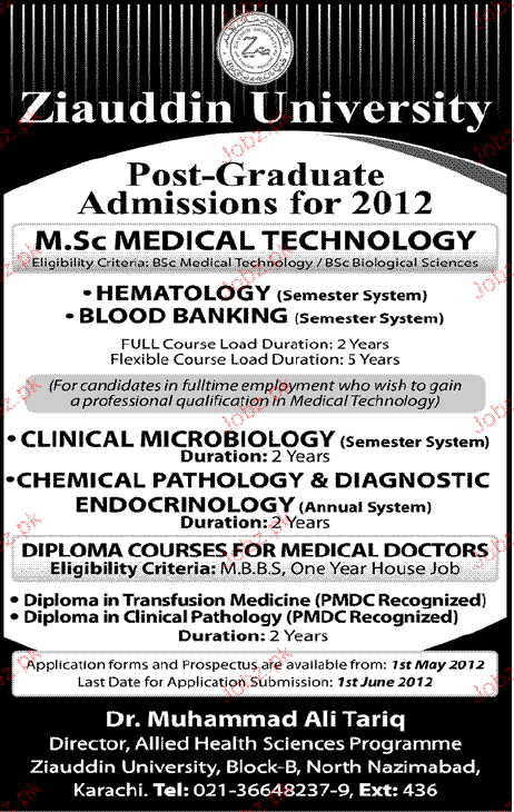 Admission in MSc in Ziauddin University in Karachi Read newspaper ad for exact details.