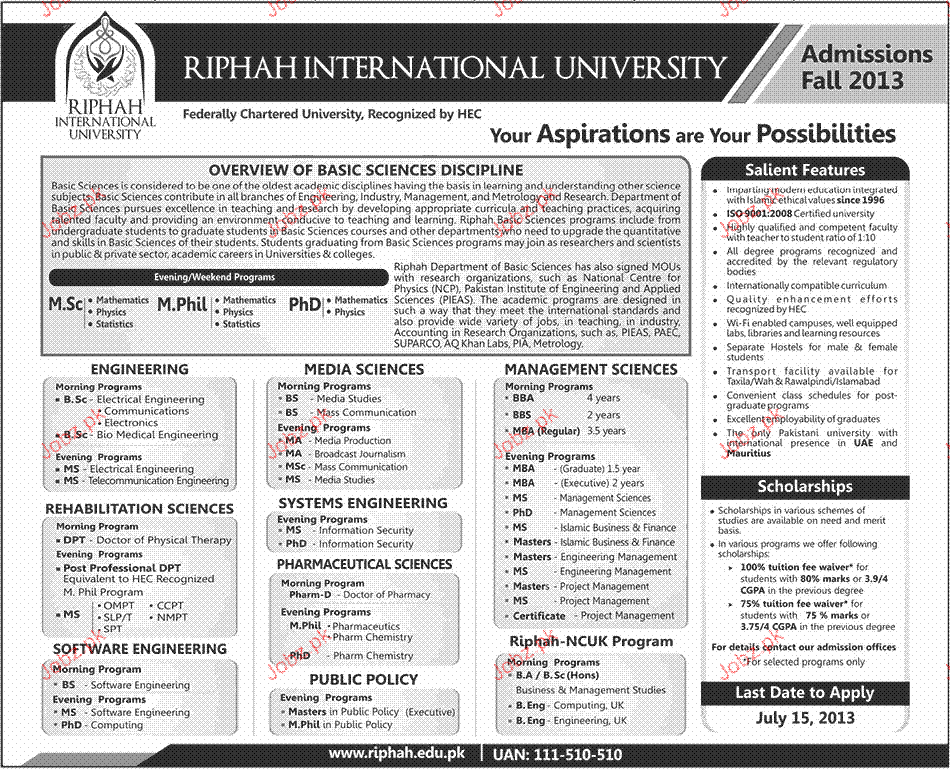Admission in MSc, Mphill and Phd in Ripha International University in Islamabad Read newspaper ad for exact details.