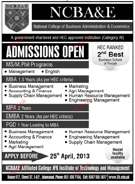 Admission in MS/Mphill, MBA, PGD and EMBA in National College of Business Administration & Economics in Islamabad Read newspaper ad for exact details.