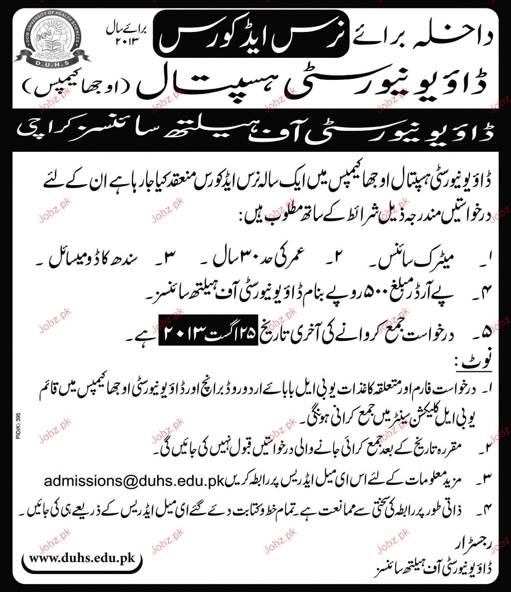 Admission in Nurses Aid Courses in Dow University of Health Sciences in Karachi Read newspaper ad for exact details.