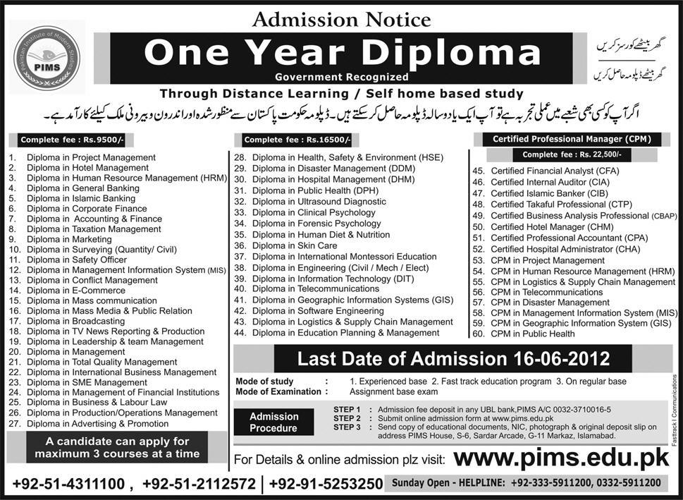 Admission in One Year Diploma in Skill Development Council in Peshawar Read newspaper ad for exact details.