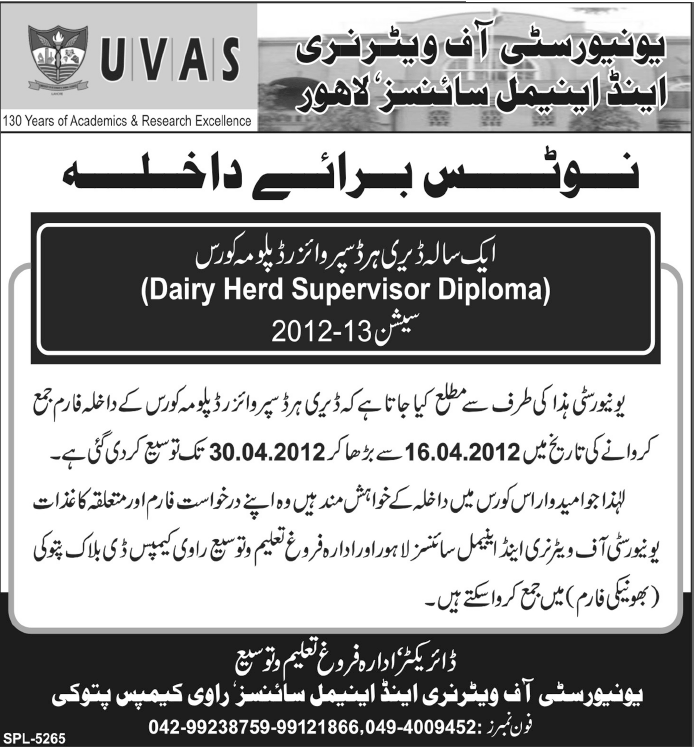 Admission in One Year Supervisor Diploma Course in University of Veterinary and Animal Science in Lahore Read newspaper ad for exact details.