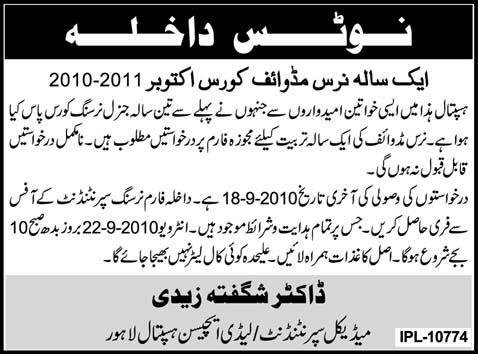 Admission in One year Diploma Nurse Midwife Course in Lady Echsion Hospital , Lahore Read newspaper ad for exact details.