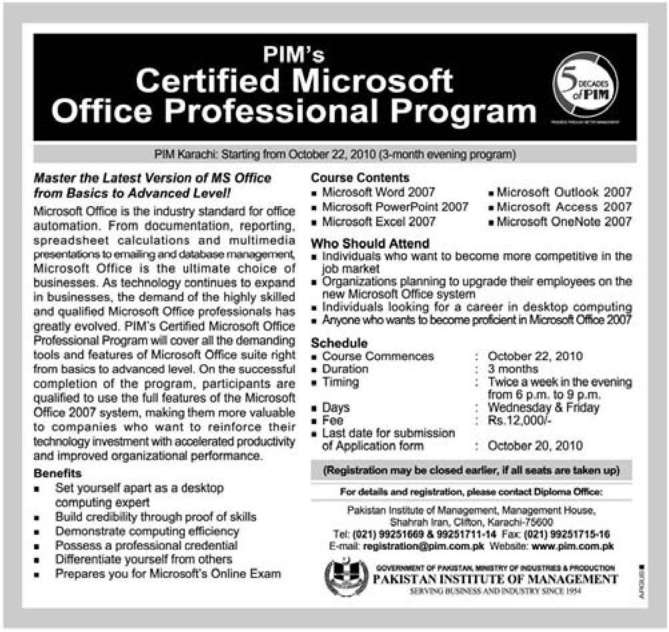 Admission in Pakistan Institute of Management Professional Courses. Karachi Read newspaper ad for exact details.