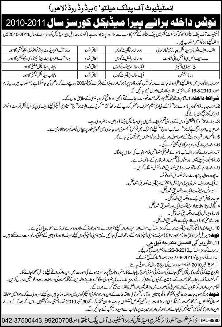 Admission in Para Medical Courses in Institute Of Health, Lahore Read newspaper ad for exact details.