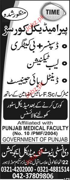 Admission in Medical Diploma in Dispenser, Lab Technicians and Dental in The Institute of Medical Education in Lahore Read newspaper ad for exact details.