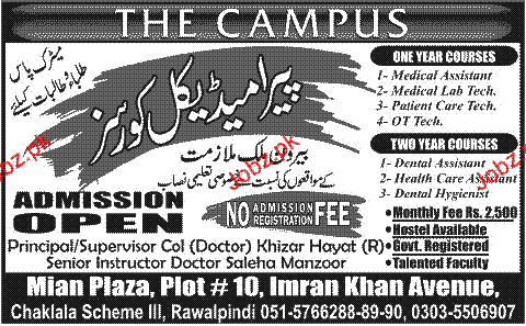 Admission in Para Medical Courses in The Campus in Rawalpindi Read newspaper ad for exact details.