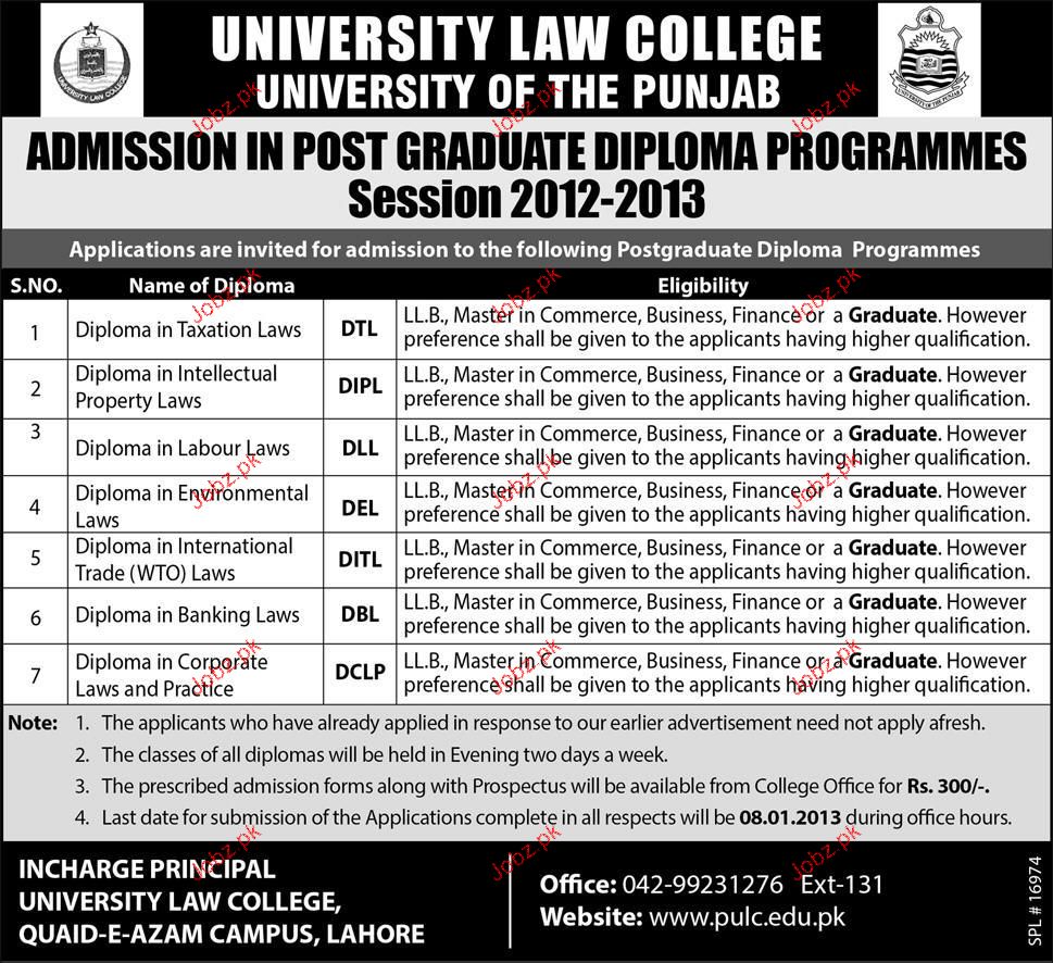 Admission in PGD in DTL, DIPL, DEL, DITL and DBL in University of the Punjab in Lahore Read newspaper ad for exact details.