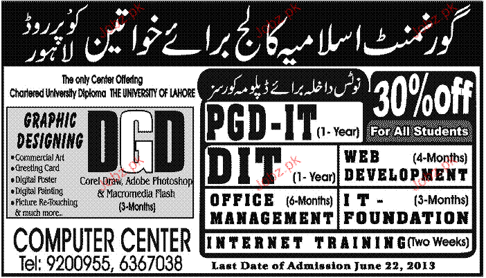 Admission in PGD-IT and DIT in Government Islamaia College For Women in Lahore Read newspaper ad for exact details.