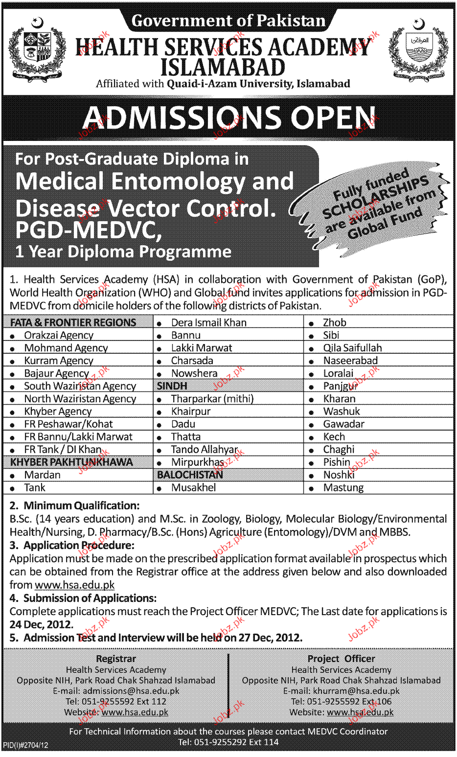 Admission in PGD-MEDVC in Health Service Academy Islamabad Read newspaper ad for exact details.