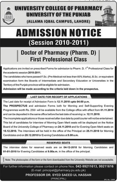 Admission in Pharm.D in first Class in University College Of Pharmacy University Of Punjab Read newspaper ad for exact details.