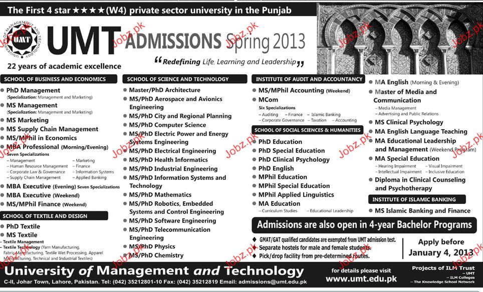 Admission in Phd, MS, MBA and M.Com in University of Management and Technology in Lahore Read newspaper ad for exact details.
