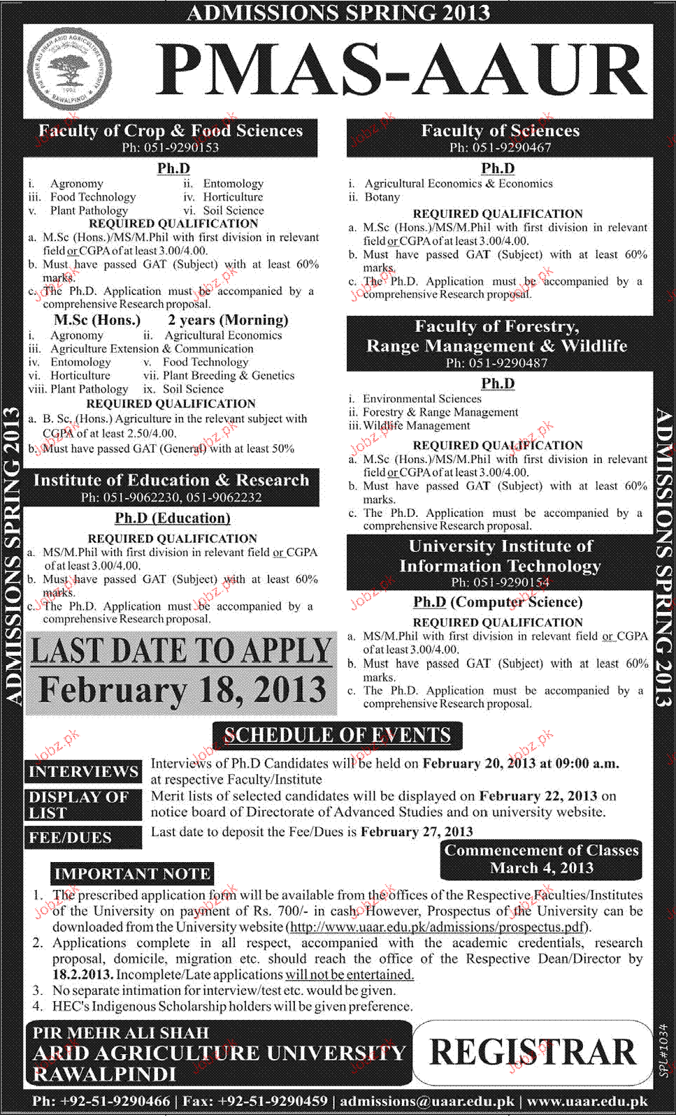 Admission in Phd and Msc in Arid Agriculture University Rawalpindi Read newspaper ad for exact details.