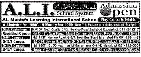 Admission in Play Group to Matric in ALI School System in Islamabad Read newspaper ad for exact details.
