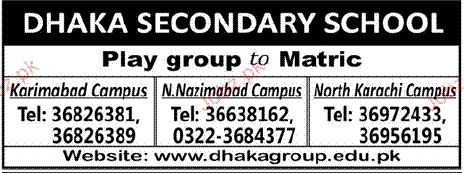Admission in Play Group to Matric in Dhaka Secondary School in Karachi Read newspaper ad for exact details.
