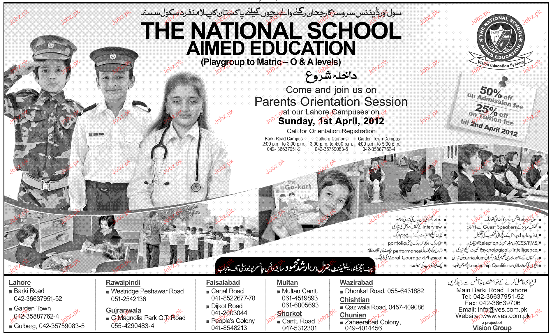 Admission in Play Group to Matric in The National School Aimed Education in Faisalabad Read newspaper ad for exact details.