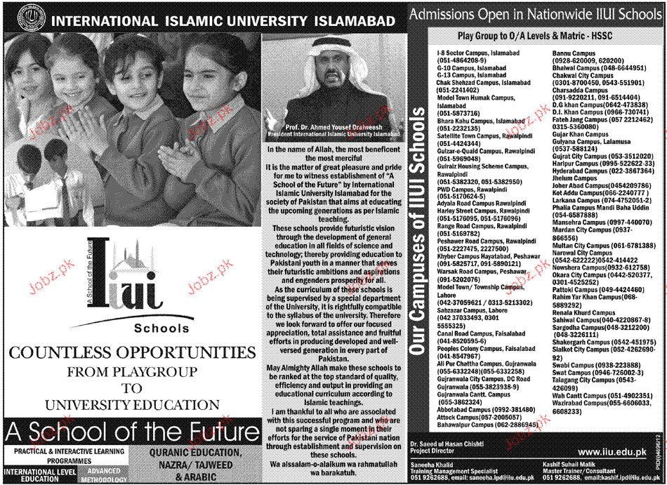 Admission in Playgroup to Matric in International Islamic University in Islamabad Read newspaper ad for exact details.