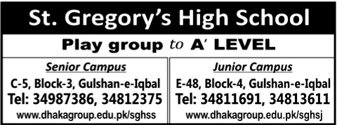 Admission in Playgroup to Matric in St Gregory's High School in Karachi Read newspaper ad for exact details.
