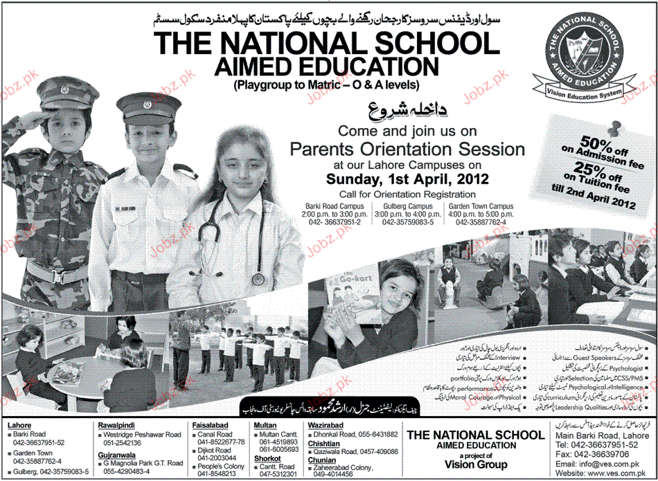 Admission in Playgroup to Matric in The National School Aimed Education in Lahore Read newspaper ad for exact details.