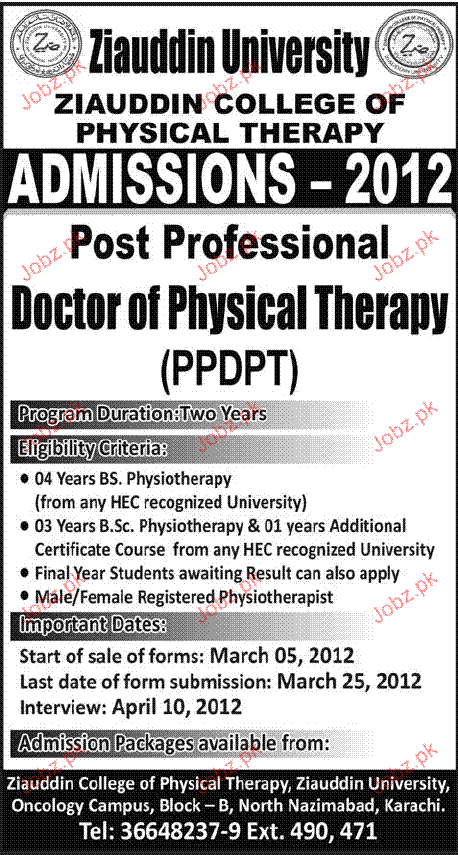 Admission in Doctor of Physical Therapy in Ziauddin University in Karachi Read newspaper ad for exact details.