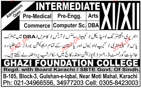Admission in Pre Medical, Pre Engineering, Arts, Commerce, Computer Sci and DBA in Ghazi Foundation College in Karachi Read newspaper ad for exact details.