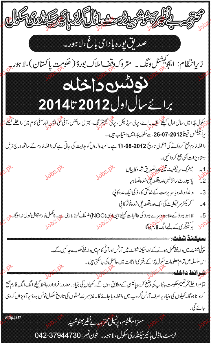 Admission in Pre Medical, PreEngineering, ICS, ICOM anf Gen Sci Group in Mothrama Benazir Bhutto Shaheed Trust Model Girls Higher Secondary School in Lahore Read newspaper ad for exact details.