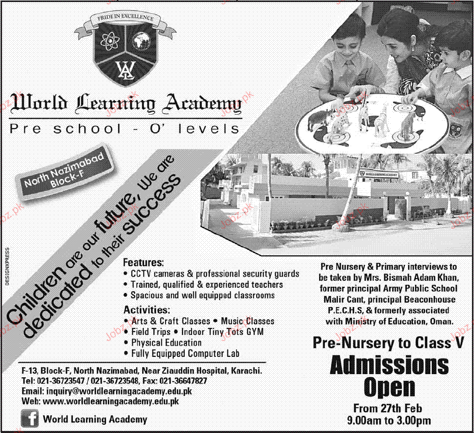 Admission in Pre Nursery to Class V World Learning Academy in Karachi Read newspaper ad for exact details.