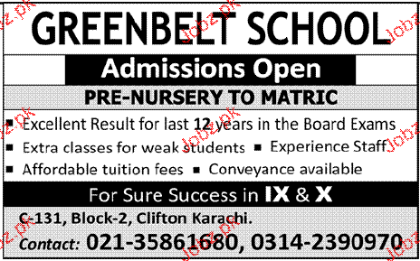 Admission in Pre Nursery to Matric in Greenblet School in Karachi Read newspaper ad for exact details.