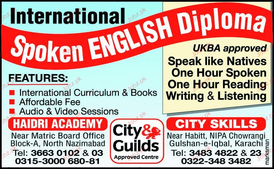 Admission in Spoken English Diploma in Haidery Academy in Karachi Read newspaper ad for exact details.