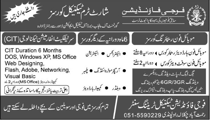 Admission in Technical Courses in Fauji Foundation in Rawalpindi Read newspaper ad for exact details.