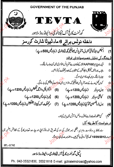 Admission in Technical Courses in Civil Surveyor, Quantity Surveyor and Civil Draftsmanin Government College of Technology in Lahore Read newspaper ad for exact details.