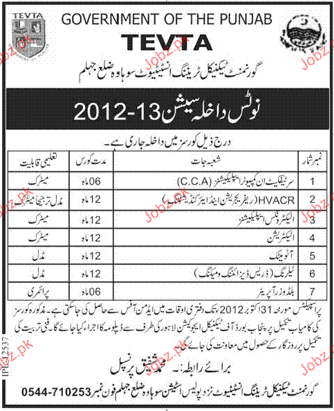 Admission in Technical Courses in Government Technical Training Institute in Jhelum Read newspaper ad for exact details.