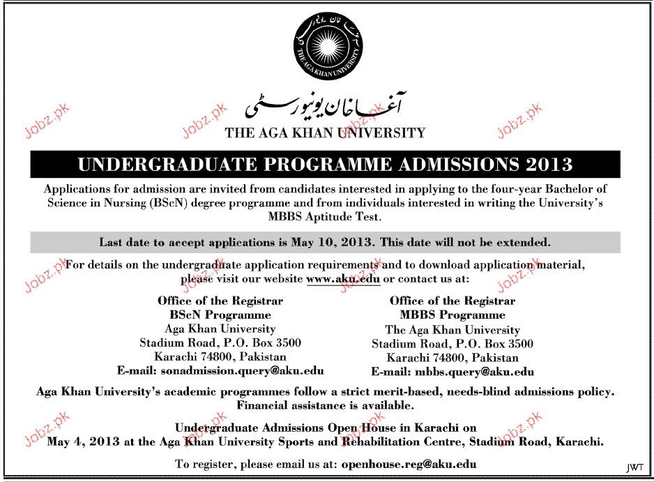 Admission in Undergraduate Program in The Aga Khan University in Karachi Read newspaper ad for exact details.