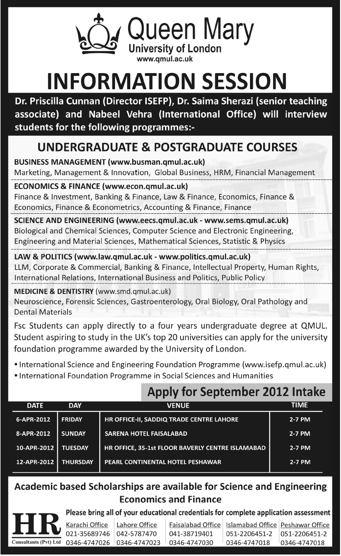 Admission in Undergraduate and Postgraduate Programs in Queen Mary University in London Read newspaper ad for exact details.