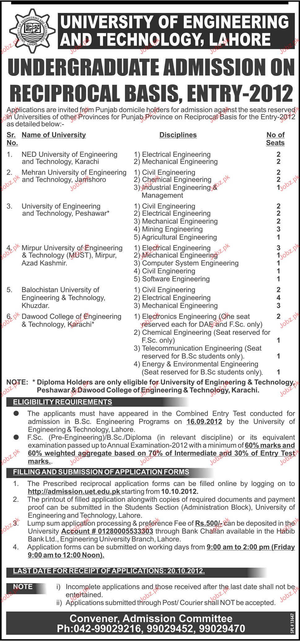 Admission in Undergraduate Programs in University of Engineering and Technology in Lahore Read newspaper ad for exact details.
