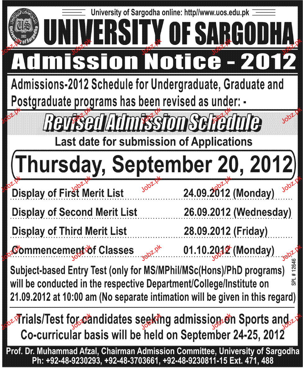 Admission in Undergraduate, Graduate and Postgraduate Progrmms in University of Sargodha in Sargodha Read newspaper ad for exact details.