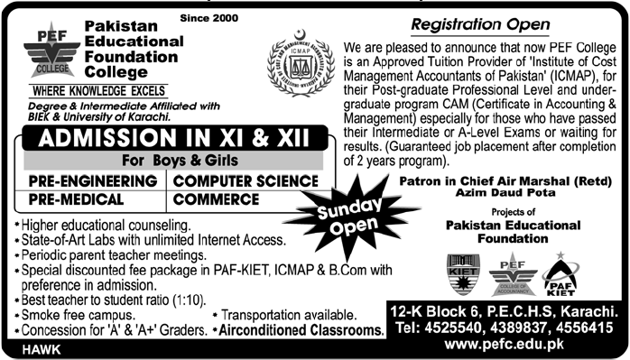Admission in XI & XII Commerce, Pre- Engineering & Medical Pakistan Educational Foundation College. Karachi Read newspaper ad for exact details.