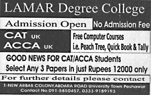 Admission Open for CAT uk and ACCA uk in LAMAR Degree College Peshawar Read newspaper ad for exact details.
