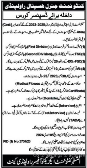 Admissions in Cantonment General Hospital Rawalpindi 2023 for Dispenser Course has been announced. Eligible students who qualify as per admission criteria in Cantonment General Hospital Rawalpindi Rawalpindi Punjab Pakistan can apply in Management College for academic year 2023. Students for admissions in Course & criteria can apply as per Private institute admission policy 2023 before closing date January 5, 2024 as per advertisement. Read newspaper ad for exact details.