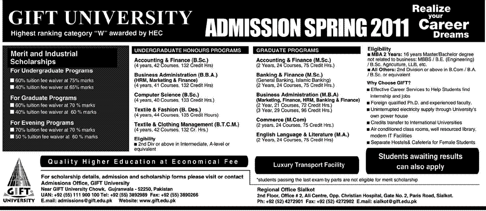 Admission Open for Spring 2011 in different programs Accounting and Finance B.Sc, Business Administration, Textile and Fashion, Accounting and Finance M.Sc, Banking and Finance M.SC MBA in Business Administration, Commerce in GIFT University Gugranwala Read newspaper ad for exact details.